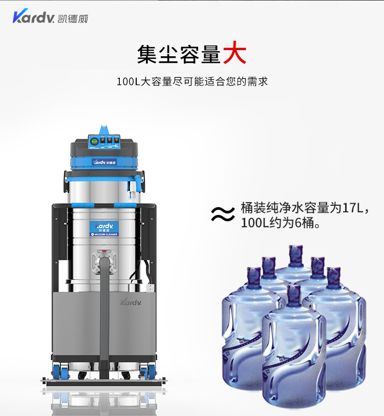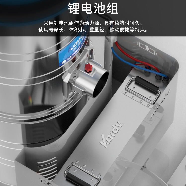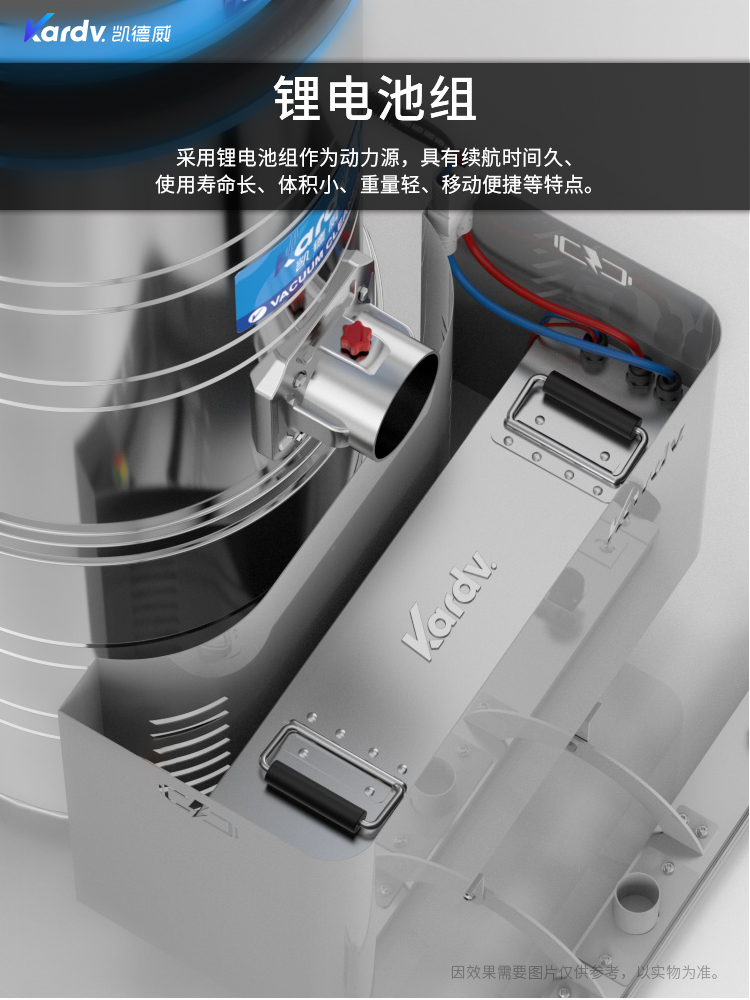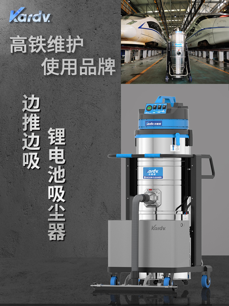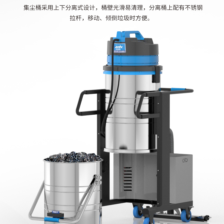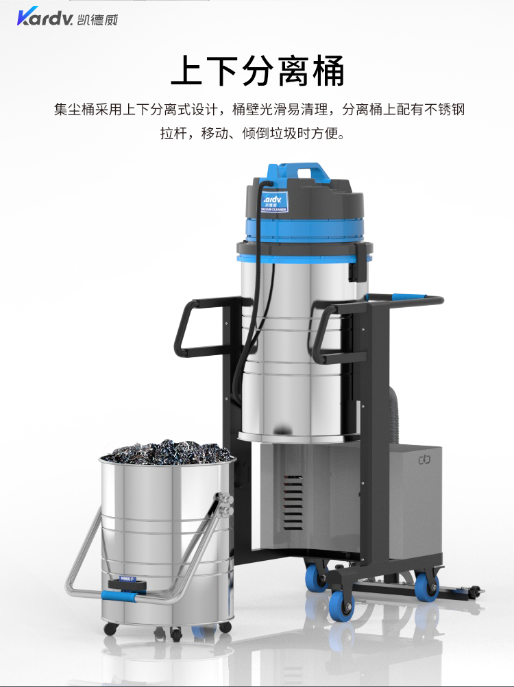 DL-3010L凱德威鋰電池吸塵器是我司的一款充電式工業吸塵器,摒棄了常規拖線式吸塵器使用范圍的局限性。此款吸塵器利用鋰電池組做為電力源,不需外接電源,操作簡單方便。100L不銹鋼集塵桶采用上下分離式設計,桶壁光滑易清理,分離桶上配有不銹鋼拉桿,移動、傾倒垃圾時方便,移動便捷,續航時間久,隨充隨用,簡單方便。機器除常規手持式吸塵外,裝置有60cm寬可推吸扒頭,可以邊推邊吸,用于大面積地面除塵。