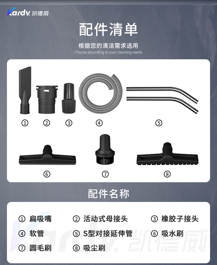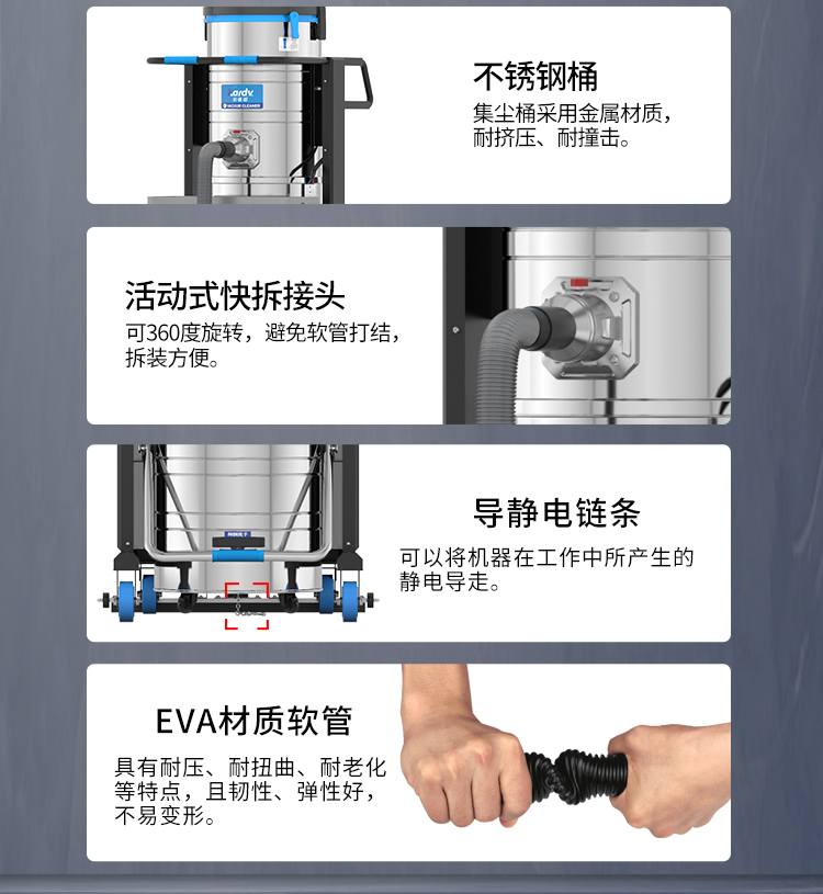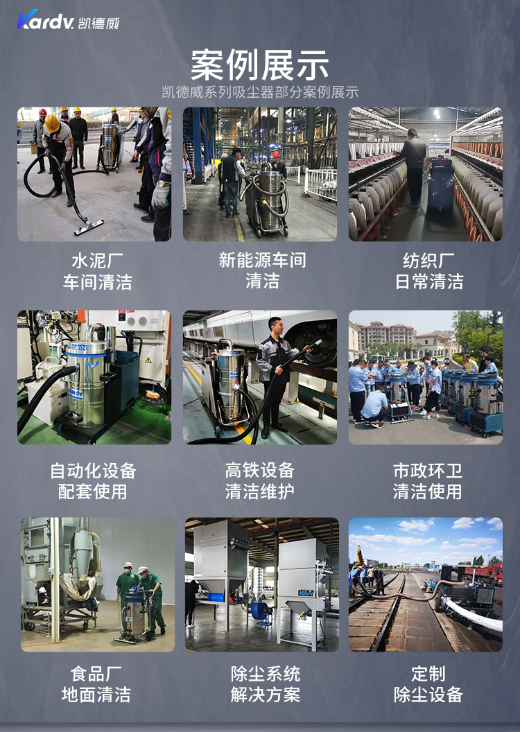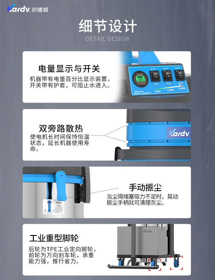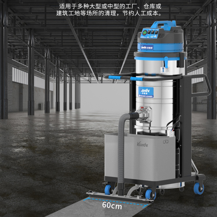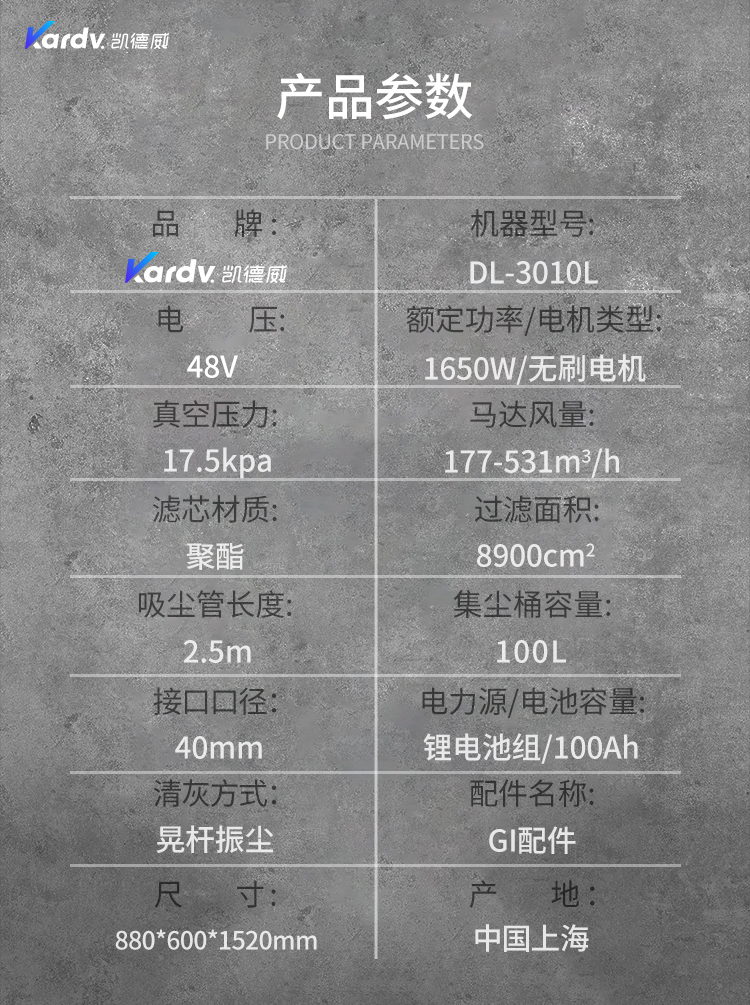 DL-3010L凱德威鋰電池吸塵器是我司的一款充電式工業吸塵器,摒棄了常規拖線式吸塵器使用范圍的局限性。此款吸塵器利用鋰電池組做為電力源,不需外接電源,操作簡單方便。100L不銹鋼集塵桶采用上下分離式設計,桶壁光滑易清理,分離桶上配有不銹鋼拉桿,移動、傾倒垃圾時方便,移動便捷,續航時間久,隨充隨用,簡單方便。機器除常規手持式吸塵外,裝置有60cm寬可推吸扒頭,可以邊推邊吸,用于大面積地面除塵。