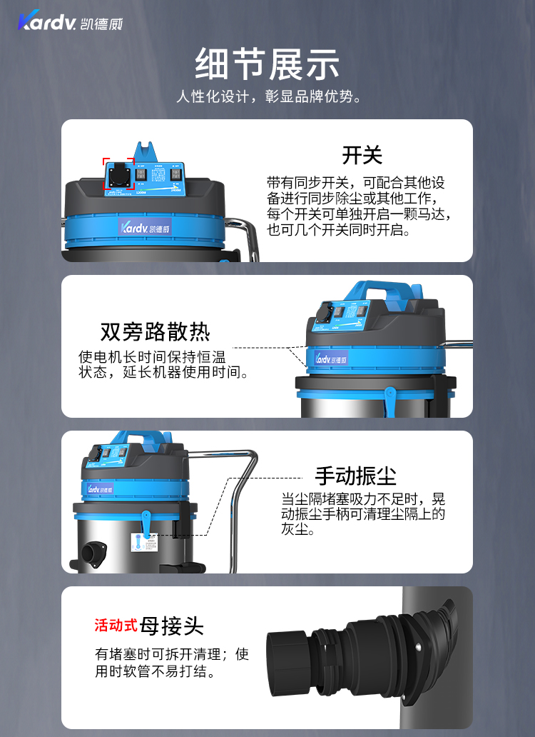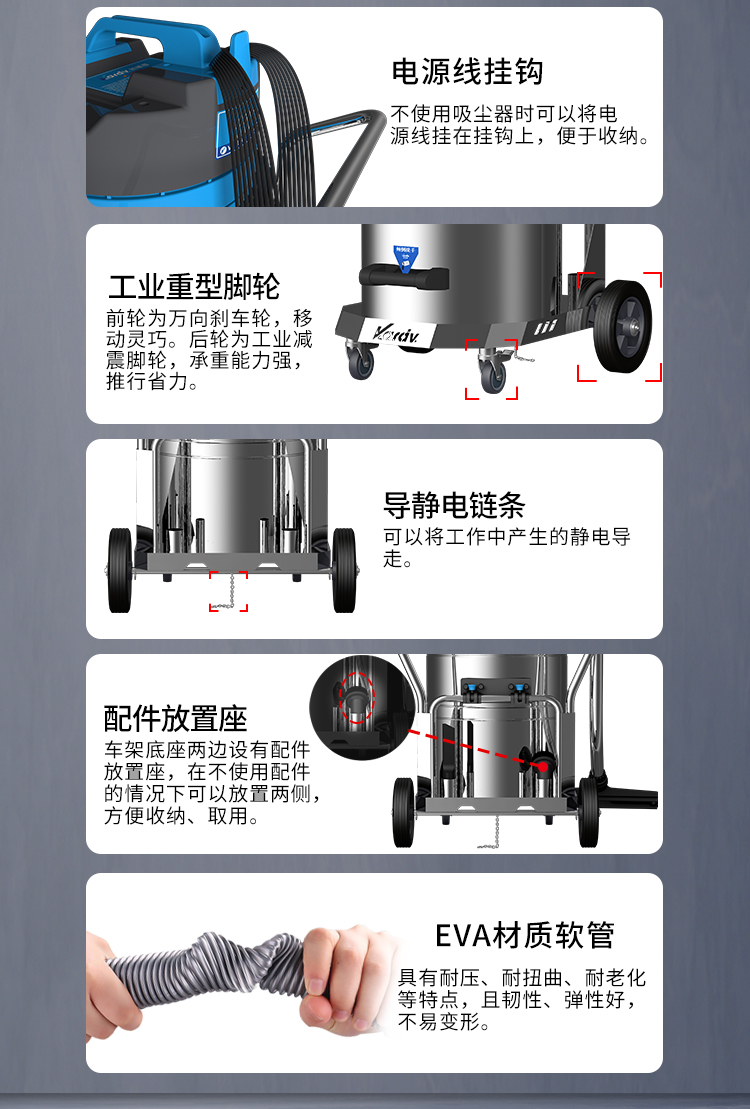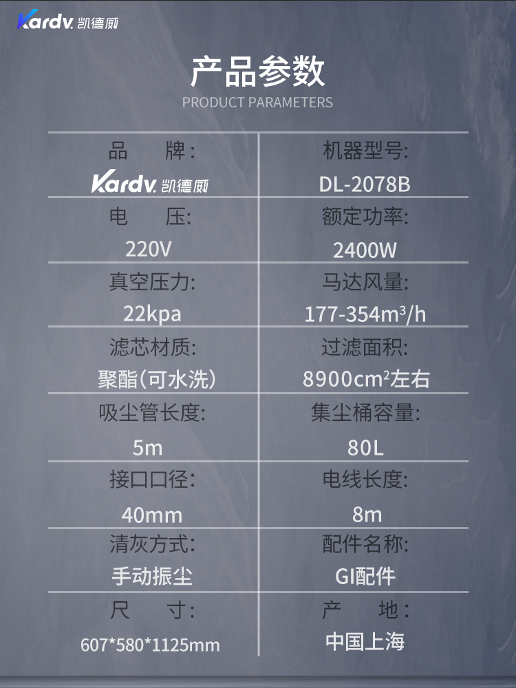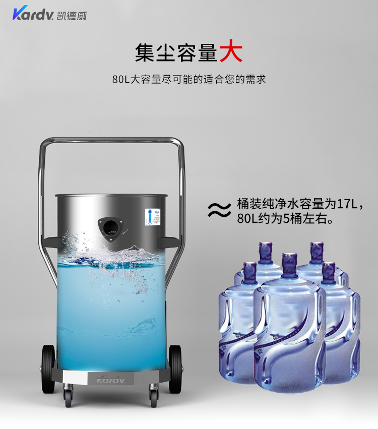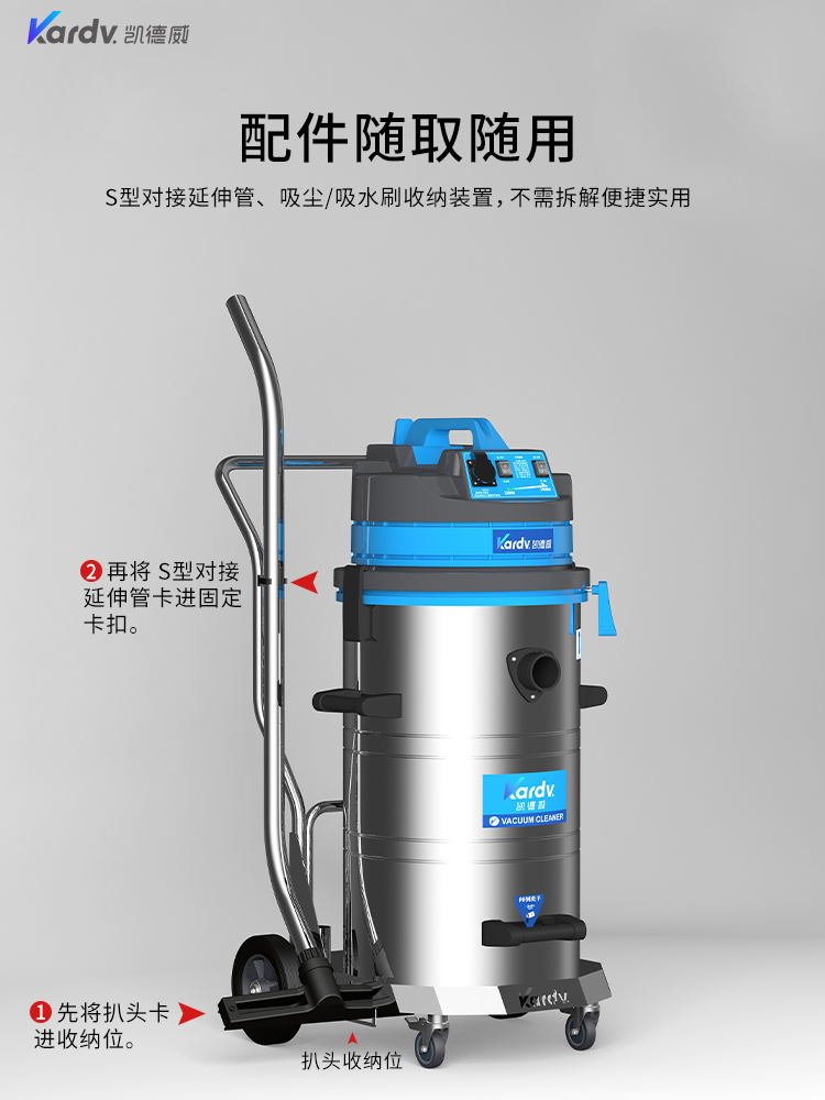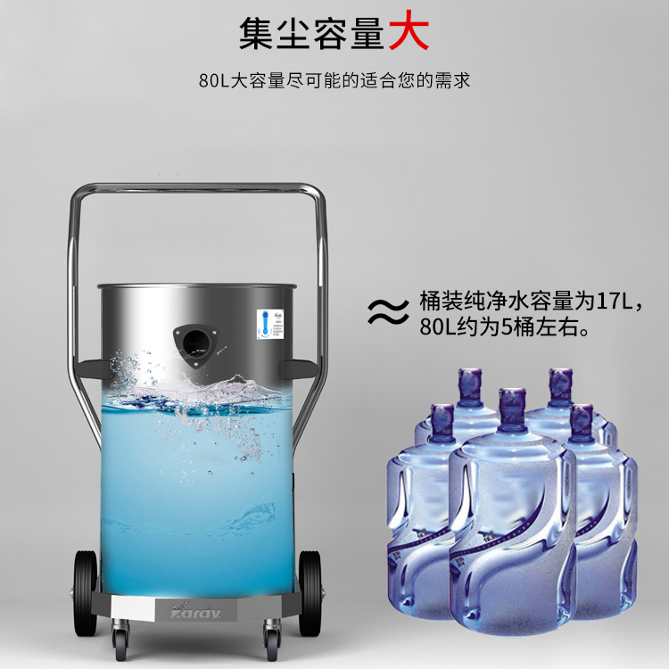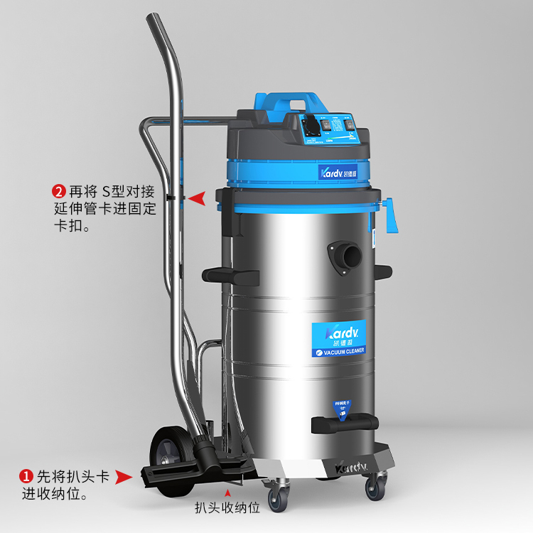 DL-2078B是一款工商業吸塵器,有2顆馬達,可單獨或聯合開啟;集塵桶為80L,為不銹鋼材質,配有不銹鋼車架,在移動時輕巧方便;配有手動晃動振塵,在使用的過程中,左右晃動振塵手柄就可以起到清理過濾器的作用。新款不銹鋼車架,美觀結實,具有收納配件功能,可以用在工廠、倉庫或建筑工地等場所清理灰塵等,在商業環境中也可以使用。